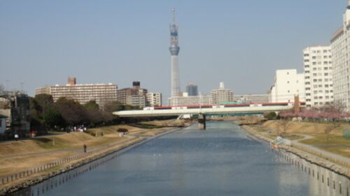 ふれあい橋から。 十間橋の近くの柳島歩道橋から。逆さツリーが綺麗。 十間橋から。 京成橋から。オフィス棟がかなりできていた。 東武橋から。
